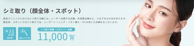 | シミ取り単発 最低価格 | シミ取りレーザー3 初回3個まで7,800円 ※大きさ問わず | ピコショット(シミ取り) 1mm3,300円~ | 10mm以下1箇所 20,900円 |