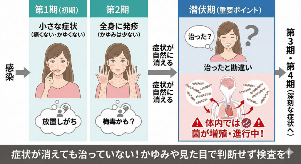 梅毒の症状は、進行の途中で 一時的に症状が消えることがあります。