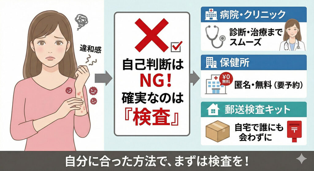 | 自宅検査 | 誰にも会わず、自分のタイミングでできる | 落ち着いて確認したい人 |