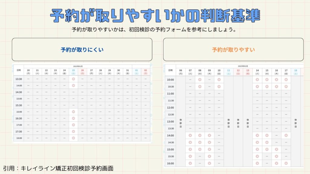 「予約が取りやすいか」もマウスピース矯正選びにおいて重要な要素です。