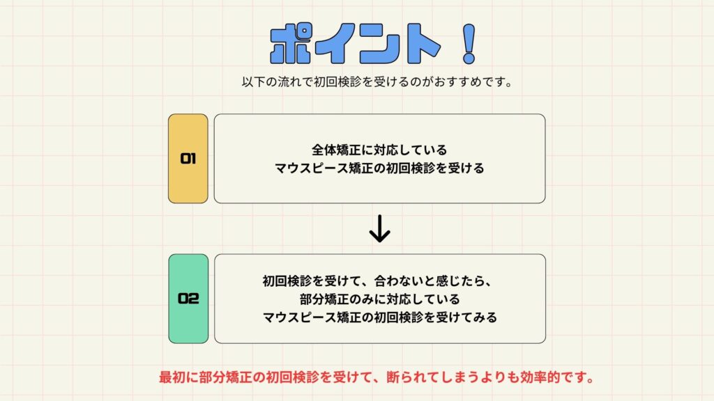 マウスピース矯正選びでは、「初回検診を受けて、自分に合わなそうだと感じたら別のマウスピース矯正の初回検診を受ける」という流れで進めていきます。