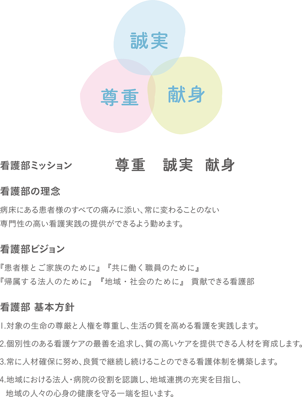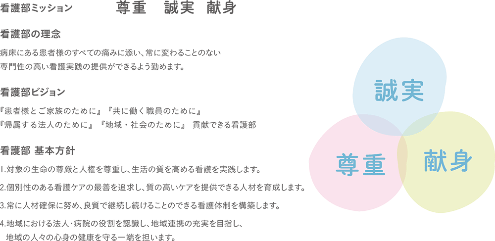看護部では病院の理念に基づき、以下に掲げる看護部の『ミッション』 『理念』 『ビジョン』を大切に専門職業人として、常に患者様の心身の〝痛み〟を感じとる心を培い、変わることのない専門性の高い看護実践を提供し続けるよう研鑽を重ねてまいります。