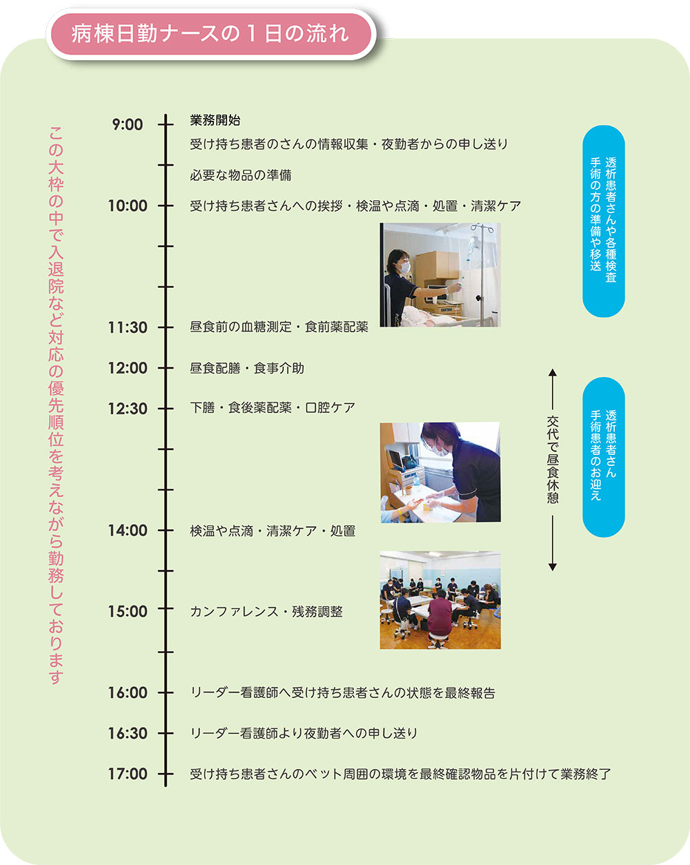 (宮本師長)専門的技術・知識が得られる。透析:患者さんのQOLを考えながら患者・家族のケア・サポートすることができる。OPE:術前・術中・術後を通して患者さんの安全・安心を第1に考え看護提供ができる。